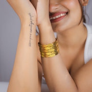Elevate your summer look with Aura’s Golden Beach Cuffs. Featuring a sleek, sculpted design in a soft gold finish, these cuffs are made to complement breezy whites and sun-kissed skin.